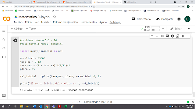 Ahora, resolvamos el problema en python utilizando el siguiente script, escrito en la plataforma colab de google: